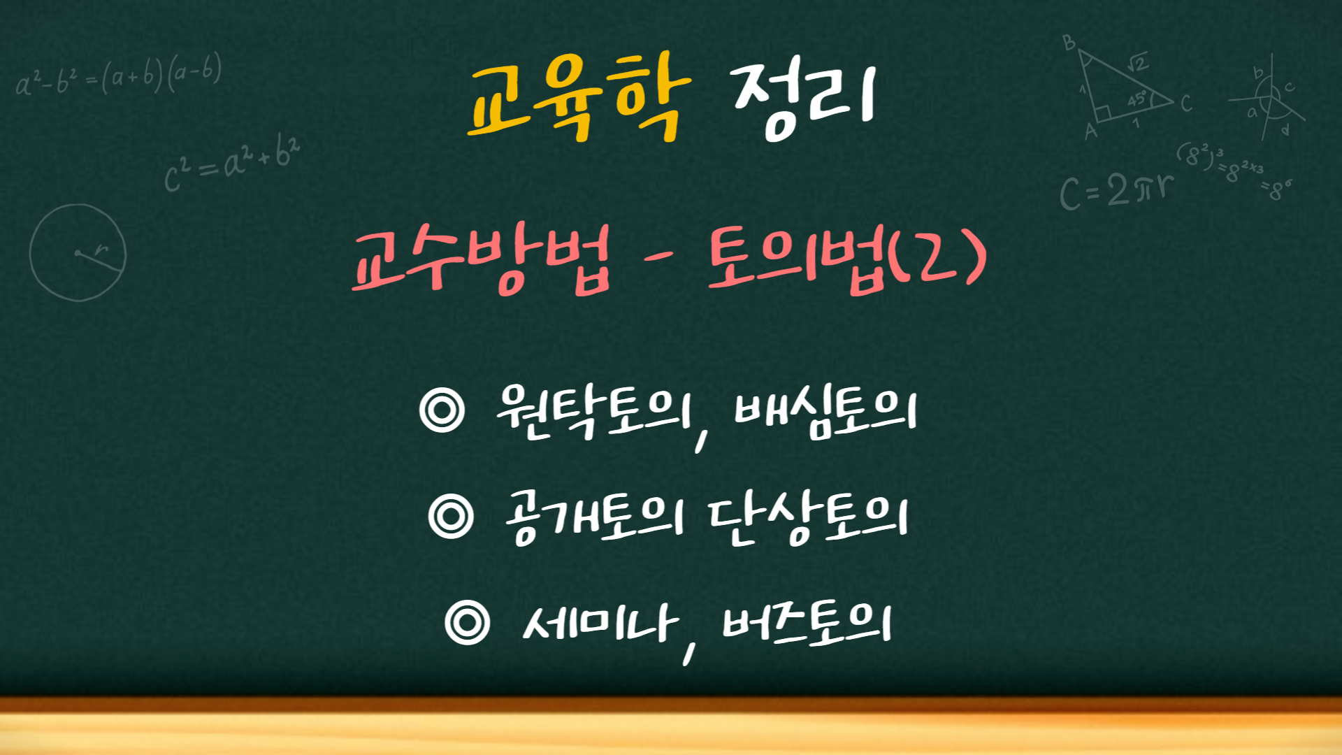 토의법은 2020년 중등 교육학 논술에 등장한 개념인 만큼 반드시 알고 넘어가야 한다. 토의법은 학생의 능동적 참여를 중시하는 최근의 교육 관심사와 부합하고 또 토의법의 유형도 매우 다양하기 때문에 언제 다시 출제된다고 해도 이상하지 않다. 저번 포스팅 토의법(1)편에서 토의법의 목적 및 일반적 절차, 장단점과 효과적인 토의를 위해 고려해야 하는 상황에 대해 알아보았다. 이번 토의법(2)편에서는 수업에 사용할 수 있는, 그래서 교육학 논술에 등장할 수 있는 토의의 종류를 모두 정리해서 포스팅하려고 한다.