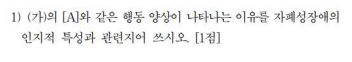 2020 초등 A 4번문제의 [A]를 보면 스스로 계획하고 수행하는데 어려움을 보이고, 변화가 생겼을 때 유연하게 대처하지 못하고 충동적인 행동을 보이는 것으로 보아 1)번 문제의 정답은 실행기능의 결함임을 알 수 있다.