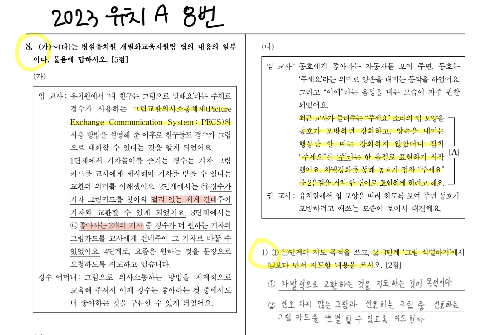 해설 : (1) 활동 3의 [A]에 해당하는 단계는 PECS의 6단계를 나타내고 있으므로 정답은 "그림교환의사소통 체계"이다.