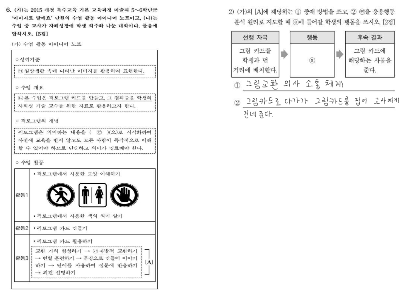 해설 : (1) (ㄱ)에서 경수가 멀리있는 그림카드를 교사에게 가져다주고 있으므로 PECS 6단계 중 2단계 자발적 교환개념 익히기 단계임을 알 수 있다. 따라서 (ㄱ)단계의 목표는 자발적으로 교환하는 것을 지도하는 것이 목적이다.
