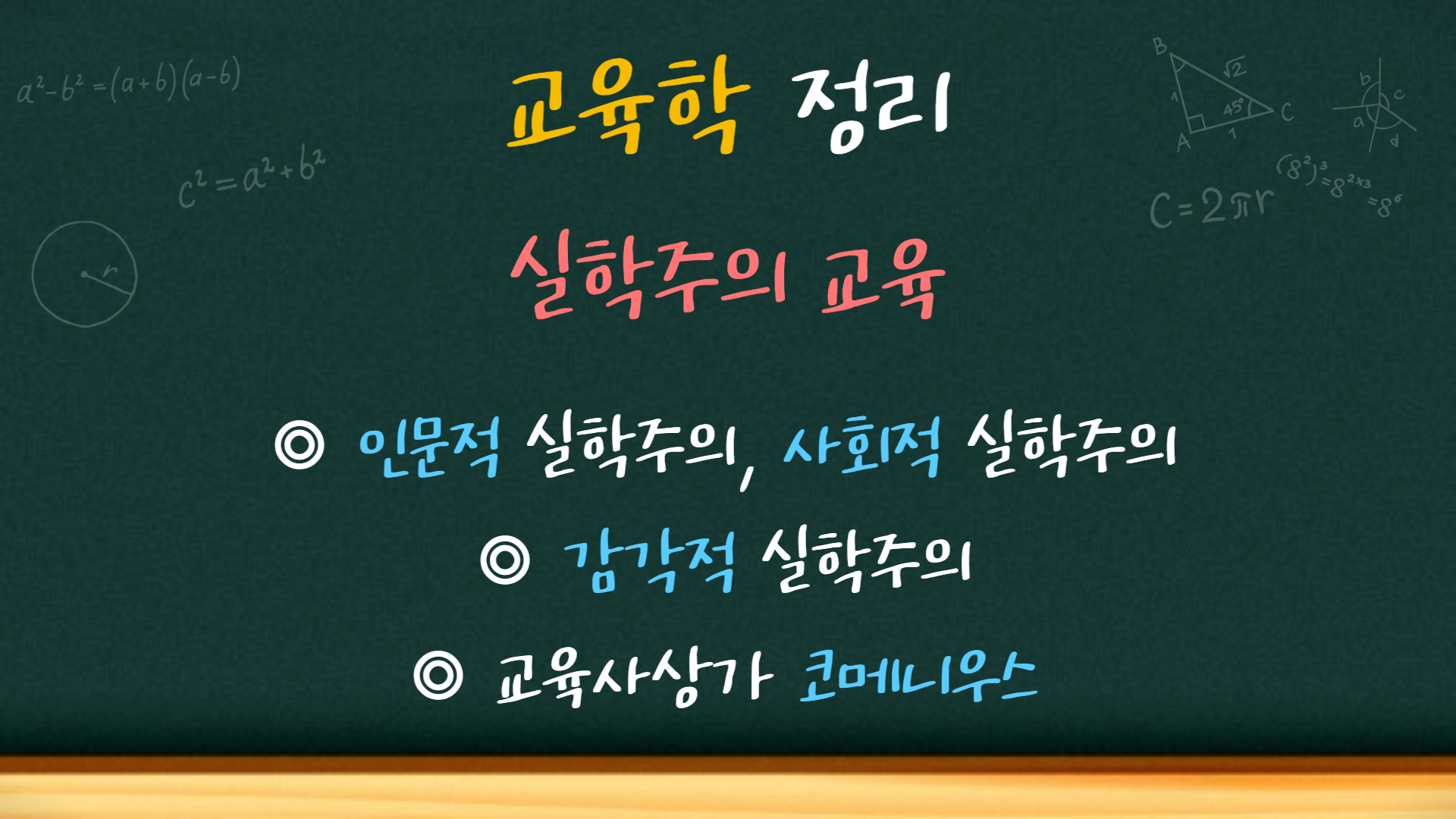 실학주의는 교육의 이론 및 시제에서 관념적인 것보다 실용성과 실천성을 중요시하는 교육사조이다. 인문주의 교육사조와 달리 언어로 표현되는 추상적 관념의 습득보다는 구체적 사물에 대한 직접적 경험을 강조하며, 언어 또는 문학보다 자연현상이나 사회제도를 연구 대상으로 하여 현실 생활에 대한 구체적이고 실제적인 학습을 강조하는 경험주의 교육사조이다. 실학주의 교육사조는 인문적 실학주의와 사회적 실학주의 그리고 05년도 중등 임용고시에 출제되었던 감각적 실학주의로 나눌 수 있다. 이어지는 글에서 각각의 특징을 알아보고 마지막으로 실학주의 교육 사상가 코메니우스에 대해서도 알아보고자 한다.